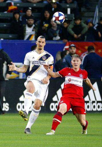 LA Galaxy forawrd Zlatan Ibrahimovic, left, of Sweden, kicks the ball away from Chicago Fire midfielder Bastian Schweinsteiger of Germany in the first half of an MLS soccer match in Carson, Calif., Saturday, March 2, 2019. (AP Photo/Ringo H.W. Chiu) The Associated Press