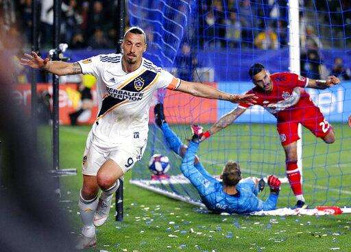 LA Galaxy forawrd Zlatan Ibrahimovic, left, of Sweden, celebrates his goal against the Chicago Fire in the second half of an MLS soccer match in Carson, Calif., Saturday, March 2, 2019. (AP Photo/Ringo H.W. Chiu) The Associated Press