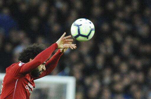 Liverpool's Mohamed Salah throw the ball during the English Premier League soccer match between Everton and Liverpool at Goodison Park in Liverpool, England, Sunday, March 3, 2019. (AP Photo/Rui Vieira) The Associated Press