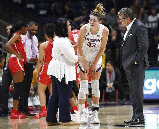 Connecticut head coach Geno Auriemma, right, and trainer Janelle Francisco, left, look at Connecticut's Katie Lou Samuelson after a hard fall to the court during the first half of an NCAA college basketball game against Houston, Saturday, March 2, 2019, in Storrs, Conn. (AP Photo/Jessica Hill) The Associated Press