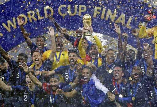 FILE - In this Sunday, July 15, 2018 file photo, France goalkeeper Hugo Lloris holds the trophy aloft after the final match between France and Croatia at the 2018 soccer World Cup in the Luzhniki Stadium in Moscow, Russia. France won the final 4-2. FIFA says its committee for organizing competitions confirms the Asian Football Confederation will kick off the global program. This gives FIFA until early-June to decide on organizing a 32-team World Cup hosted by Qatar, or a 48-team event spreading games around the Middle East. (AP Photo/Matthias Schrader, File) The Associated Press