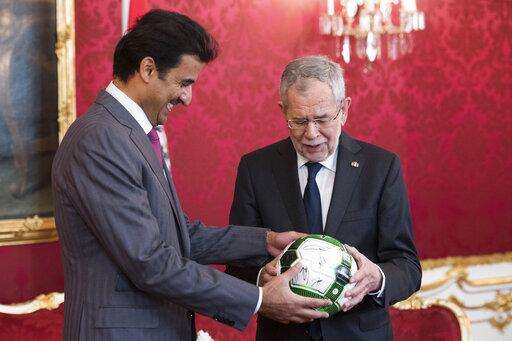 Austrian President Alexander Van der Bellen, right, hands over a football referring to the 2022 FIFA World Cup in Qatar to Qatar's Emir Sheikh Tamim bin Hamad Al Thani, left, prior to their meeting in Vienna, Austria, Tuesday, Mar. 5, 2019. (AP Photo/Michael Gruber) The Associated Press