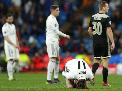 Real midfielder Gareth Bale reacts on the ground during the Champions League soccer match between Real Madrid and Ajax at the Santiago Bernabeu stadium in Madrid, Spain, Tuesday, March 5, 2019. (AP Photo/Manu Fernandez) The Associated Press