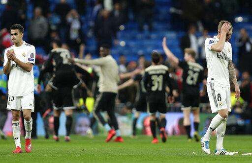 Real defender Sergio Reguilon and Toni Kroos leave the pitch as Ajax players celebrate after wining the game, at the end of the Champions League soccer match between Real Madrid and Ajax at the Santiago Bernabeu stadium in Madrid, Spain, Tuesday, March 5, 2019. (AP Photo/Manu Fernandez) The Associated Press