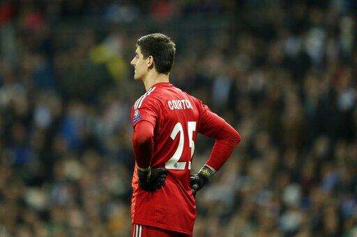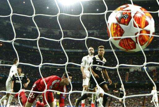 Real goalkeeper Thibaut Courtois reacts after the third goal of Ajax during the Champions League round of 16 second leg soccer match between Real Madrid and Ajax at the Santiago Bernabeu stadium in Madrid, Tuesday, March 5, 2019. (AP Photo/Bernat Armangue) The Associated Press