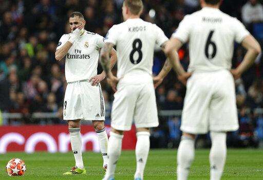 Real forward Karim Benzema waits as Ajax's David Neres celebrates scoring his side's 2nd goal, during the Champions League soccer match between Real Madrid and Ajax at the Santiago Bernabeu stadium in Madrid, Spain, Tuesday, March 5, 2019. (AP Photo/Manu Fernandez) The Associated Press