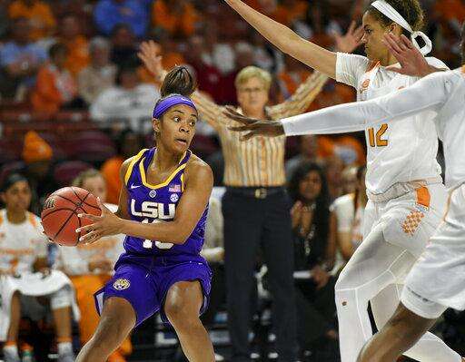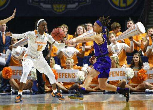 LSU's Jailin Cherry, right, passes around Tennessee's Meme Jackson during the first half of an women's Southeastern conference NCAA college basketball tournament game Thursday, March 7, 2019, in Greenville, S.C. (AP Photo/Richard Shiro)