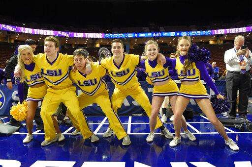 LSU cheerleaders perform during the first half of an women's Southeastern conference NCAA college basketball tournament game against Tennessee Thursday, March 7, 2019, in Greenville, S.C. (AP Photo/Richard Shiro)