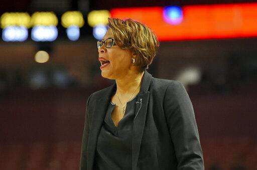 LSU head coach Nikki Fargas calls out a play during the first half of an women's Southeastern conference NCAA college basketball tournament game against Tennessee Thursday, March 7, 2019, in Greenville, S.C. (AP Photo/Richard Shiro)