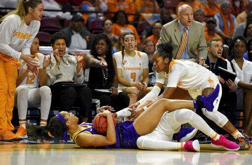 LSU's Kamera Harris, bottom, battles for a loose ball with Tennessee's Rennia Davis, hidden, and Zaay Green, right, during the first half of an NCAA college basketball game in the Southeastern Conference women's tournament, Thursday, March 7, 2019, in Greenville, S.C. (AP Photo/Richard Shiro)