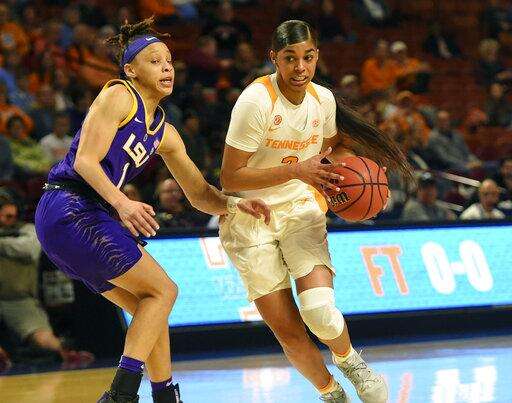 Tennessee's Evina Westbrook, right, drives against LSU's Jailin Cherry during the first half of an women's Southeastern conference NCAA basketball tournament game Thursday, March 7, 2019, in Greenville, S.C. (AP Photo/Richard Shiro)