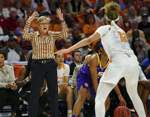 Tennessee head coach Holly Warlick, left, reacts during the first half of an NCAA college basketball game against LSU in the Southeastern Conference women's tournament, Thursday, March 7, 2019, in Greenville, S.C. (AP Photo/Richard Shiro)