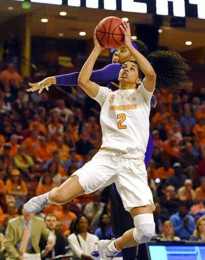 Tennessee's Evina Westbrook (2) shoots in front of LSU's Jalaysha Thomas during the second half of an NCAA college basketball game at the Southeastern Conference women's tournament, Thursday, March 7, 2019, in Greenville, S.C. (AP Photo/Richard Shiro)