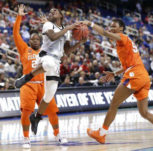 Clemson's Tylar Bennett (55) grabs the ball from Louisville's Dana Evans (1) as Clemson's Keniece Purvis (22) looks on during the first half of an NCAA college basketball game in the Atlantic Coast Conference women's tournament in Greensboro, N.C., Friday, March 8, 2019. (AP Photo/Chuck Burton) The Associated Press