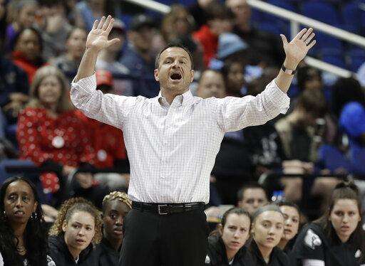 Louisville head coach Jeff Walz directs his team against Clemson during the first half of an NCAA college basketball game in the Atlantic Coast Conference women's tournament in Greensboro, N.C., Friday, March 8, 2019. (AP Photo/Chuck Burton) The Associated Press
