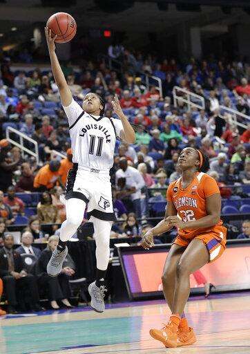 Louisville's Arica Carter (11) drives past Clemson's Chyna Cotton (32) during the first half of an NCAA college basketball game in the Atlantic Coast Conference women's tournament in Greensboro, N.C., Friday, March 8, 2019. (AP Photo/Chuck Burton) The Associated Press
