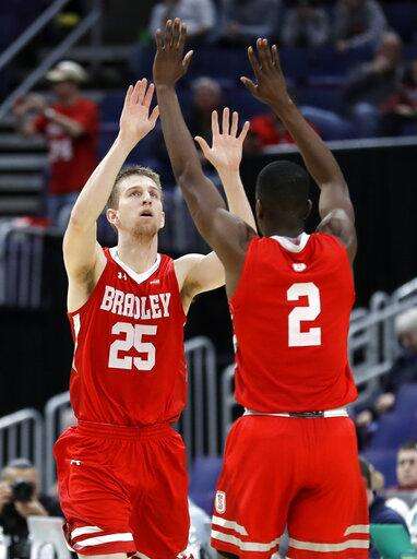 Bradley's Nate Kennell (25) is congratulated by teammate Luqman Lundy (2) after making a 3-point basket during the first half of an NCAA college basketball game against Loyola of Chicago in the semifinal round of the Missouri Valley Conference tournament, Saturday, March 9, 2019, in St. Louis. (AP Photo/Jeff Roberson)