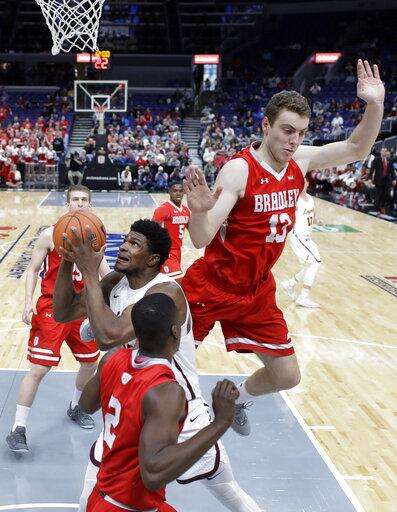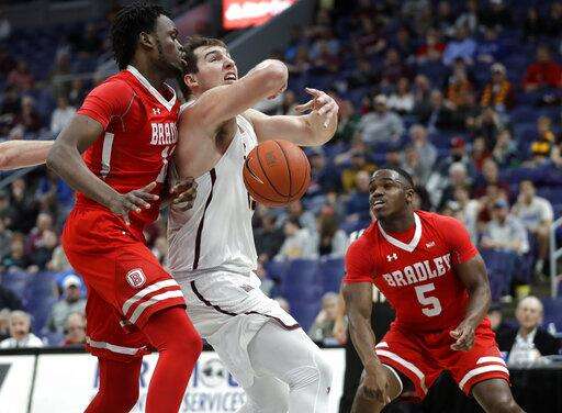 Kannell's 3-pointer from the baseline with 1:21 left gave Bradley a 53-49 lead. Townes scored inside with just over a minute to go and Bradley turned the ball over on a traveling call with 38.6 remaining. Bradley had fouls to give and used three in quick succession to get the clock down to 13 seconds with their defense forcing a last-second shot by Townes.
