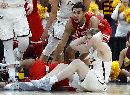 Bradley's Dwayne Lautier-Ogunleye, top, celebrates as Loyola of Chicago's Cooper Kaifes sits on the floor as the final buzzer sounds at the end of an NCAA college basketball game in the semifinal round of the Missouri Valley Conference tournament, Saturday, March 9, 2019, in St. Louis. Bradley won 53-51. (AP Photo/Jeff Roberson)