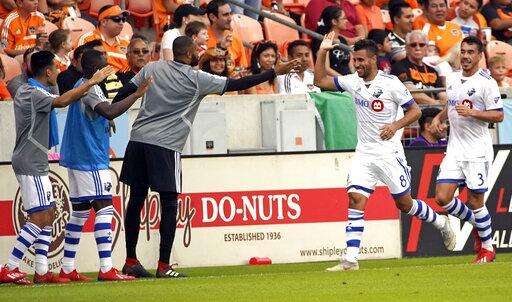 Montreal Impact's Saphir Taider (8) celebrates with teammates after scoring a goal against the Houston Dynamo during the first half of an MLS soccer match Saturday, March 9, 2019, in Houston. (AP Photo/David J. Phillip) The Associated Press