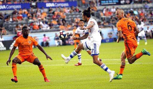 Houston Dynamo's Oscar Garcia, center, tries to keep the ball from Montreal Impact's Michael Azira, left, during the first half of an MLS soccer match Saturday, March 9, 2019, in Houston. (AP Photo/David J. Phillip) The Associated Press