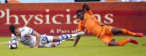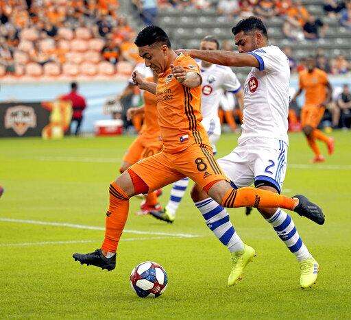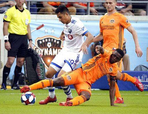 Houston Dynamo's Oscar Garcia, right, kicks the ball away from Montreal Impact's Mathieu Choiniere during the second half of an MLS soccer match Saturday, March 9, 2019, in Houston. (AP Photo/David J. Phillip) The Associated Press