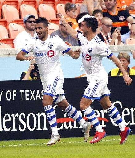 Montreal Impact's Saphir Taider (8) celebrates with Daniel Lovitz (3) after scoring a goal against the Houston Dynamo during the first half of an MLS soccer match Saturday, March 9, 2019, in Houston. (AP Photo/David J. Phillip) The Associated Press