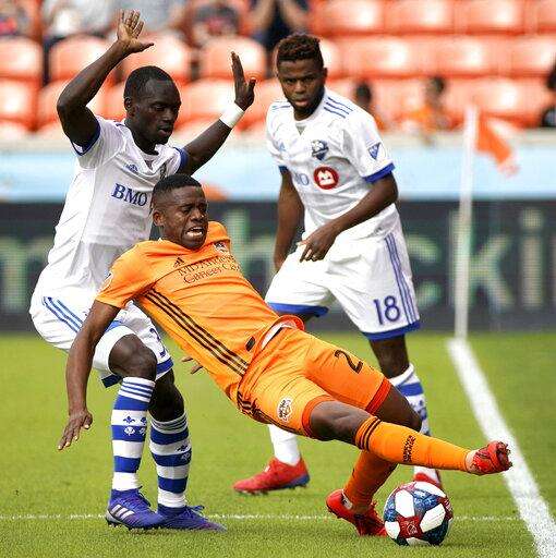 Montreal Impact's Saphir Taider (8) is tripped by Houston Dynamo's Oscar Garcia (27) during the first half of an MLS soccer match Saturday, March 9, 2019, in Houston. (AP Photo/David J. Phillip) The Associated Press