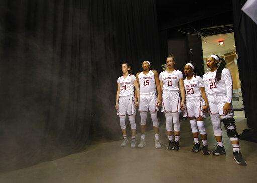 Starters for Stanford wait to be introduced before the team's NCAA college basketball game against Washington in the semifinals of the Pac-12 women's tournament Saturday, March 9, 2019, in Las Vegas. (AP Photo/John Locher) The Associated Press