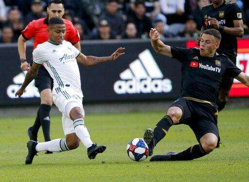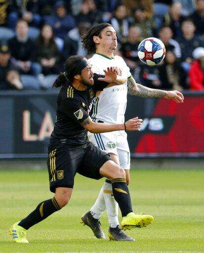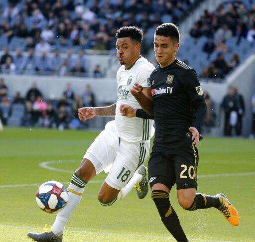 Portland Timbers forward Andy Polo, left, of Peru, and Los Angeles FC forward Christian Ramirez, vie for the ball in the first half of an MLS soccer match in Los Angeles, Sunday, March 10, 2019. (AP Photo/Ringo H.W. Chiu)