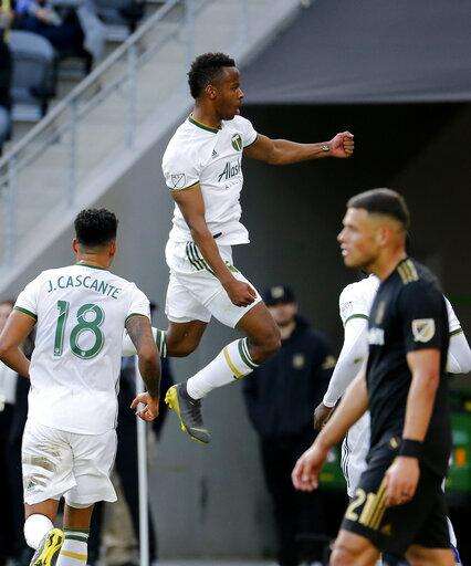 Portland Timbers forward Jeremy Ebobisse, center, celebrates his goal against Los Angeles FC in the first half of an MLS soccer match in Los Angeles, Sunday, March 10, 2019. (AP Photo/Ringo H.W. Chiu)