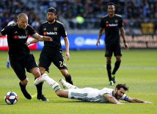 Portland Timbers midfielder Diego Valeri, front right, of Argentina, falls after being tackled by Los Angeles FC defender Jordan Harvey, left, in the first half of an MLS soccer match in Los Angeles, Sunday, March 10, 2019. (AP Photo/Ringo H.W. Chiu)