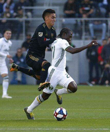 Portland Timbers defender Julio Cascante, left, of Costa Rica, and Los Angeles FC midfielder Eduard Atuesta of Colombia, vie for the ball in the first half of an MLS soccer match in Los Angeles, Sunday, March 10, 2019. (AP Photo/Ringo H.W. Chiu)