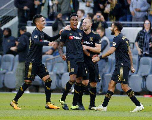Los Angeles FC midfielder Mark-Anthony Kaye, second from left, of Canada, celebrates his goal with teammates in the first half of an MLS soccer match against Portland Timbers in Los Angeles, Sunday, March 10, 2019. (AP Photo/Ringo H.W. Chiu)