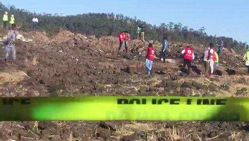 In this image taken from video, rescuers search through wreckage at the scene of an Ethiopian Airlines flight that crashed shortly after takeoff at Hejere near Bishoftu, or Debre Zeit, some 50 kilometers (31 miles) south of Addis Ababa, in Ethiopia Sunday, March 10, 2019. The Ethiopian Airlines flight crashed shortly after takeoff from Ethiopia's capital on Sunday morning, killing all 157 on board, authorities said, as grieving families rushed to airports in Addis Ababa and the destination, Nairobi. (AP Photo/Yidnek Kirubel) The Associated Press