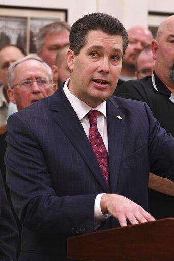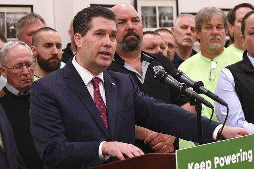 At a news conference at an Ironworkers union hall, Pennsylvania lawmaker Rep. Thomas Mehaffie discusses legislation he is introducing to pump hundreds of millions of ratepayer dollars into the state's five nuclear power plants, Monday, March 11, 2019, in Harrisburg, Pa. (AP Photo/Marc Levy) The Associated Press