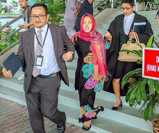 Indonesian Siti Aisyah, center, leaves Shah Alam High Court in Shah Alam, Malaysia, Monday, March 11, 2019. The Indonesian woman held two years on suspicion of killing North Korean leader's half brother Kim Jong Nam was freed from custody Monday after prosecutors unexpectedly dropped the murder charge against her. (Kyodo News via AP) The Associated Press