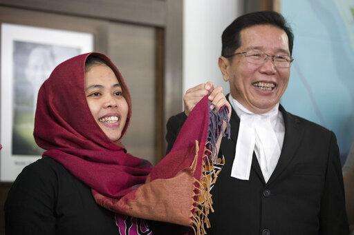 Indonesian Siti Aisyah, left, smiles next to her lawyer Gooi Soon Seng after a press conference at Indonesian Embassy in Kuala Lumpur, Malaysia, Monday, March 11, 2019. The Indonesian woman held two years on suspicion of killing North Korean leader's half brother Kim Jong Nam was freed from custody Monday after prosecutors unexpectedly dropped the murder charge against her. (AP Photo/Vincent Thian) The Associated Press
