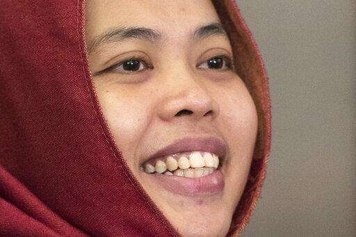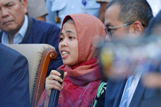 Indonesian Siti Aisyah speaks during a press conference at Indonesian Embassy after her release in Kuala Lumpur, Malaysia, Monday, March 11, 2019. The Indonesian woman held two years on suspicion of killing North Korean leader's half brother Kim Jong Nam was freed from custody Monday after prosecutors unexpectedly dropped the murder charge against her. (AP Photo/Vincent Thian) The Associated Press