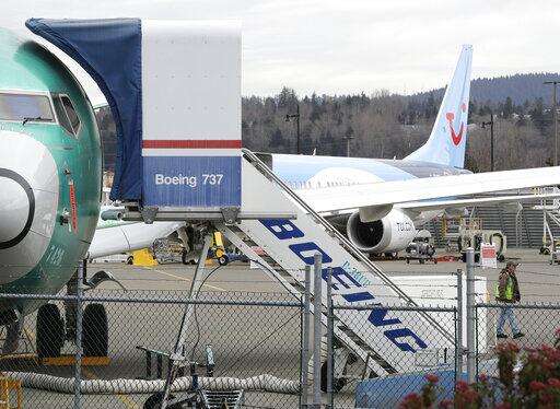 In this photo taken Monday, March 11, 2019, a Boeing 737 MAX 8 airplane being built for TUI Group sits parked in the background at right at Boeing Co.'s Renton Assembly Plant in Renton, Wash. Britain, France and Germany on Tuesday joined a rapidly growing number of countries grounding the new Boeing plane involved in the Ethiopian Airlines disaster or turning it back from their airspace, while investigators in Ethiopia looked for parallels with a similar crash just five months ago. (AP Photo/Ted S. Warren)