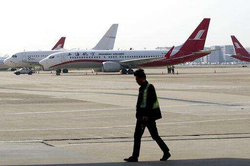 A ground crew walks near a Boeing 737 Max 8 plane operated by Shanghai Airlines parked on the tarmac at Hongqiao airport in Shanghai, China, Tuesday, March 12, 2019. U.S. aviation experts on Tuesday joined the investigation into the crash of an Ethiopian Airlines jetliner that killed 157 people, as a growing number of airlines grounded the new Boeing plane involved in the crash. (AP Photo)