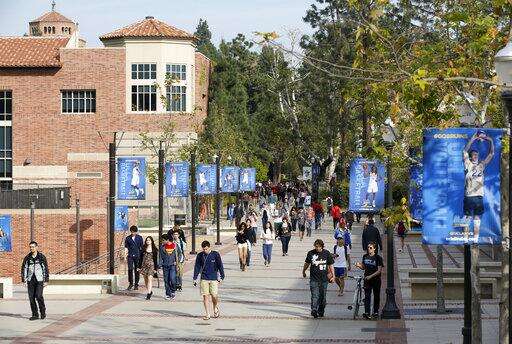 FILE - In this Feb. 26, 2015, file photo, students walk on the University of California, Los Angeles campus. Federal authorities have charged college coaches and others in a sweeping admissions bribery case in federal court. The racketeering conspiracy charges were unsealed Tuesday, March 12, 2019, against coaches at schools including UCLA, Wake Forest, Stanford, Georgetown, and the University of Southern California. (AP Photo/Damian Dovarganes, File)