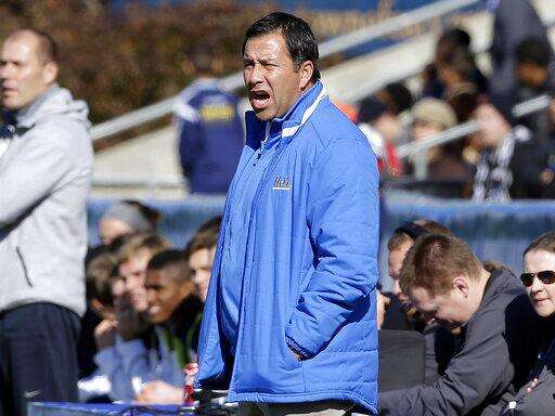 FILE - In this Dec. 14, 2014 file photo, UCLA coach Jorge Salcedo reacts during the first half of an NCAA College Cup championship soccer game against Virginia in Cary, N.C. Salcedo was charged along with nearly 50 other people Tuesday, March 12, 2019, in a scheme in which wealthy parents bribed college coaches and insiders at testing centers to get their children into some of the most elite schools in the country, federal prosecutors said. UCLA said that Salcedo has been placed on leave pending a review and will have no involvement with the team. (AP Photo/Gerry Broome, File)