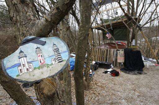 In this Tuesday, Feb. 12, 2019 photo a decorative plaque featuring lighthouses is attached to a tree near a makeshift shelter in a wooded area, in Worcester, Mass. This industrial city in central Massachusetts has had many nicknames through the years, including “the Heart of the Commonwealth” and “Wormtown.” Among them was this less-known medical moniker: “Hepatitisville.” (AP Photo/Steven Senne) The Associated Press