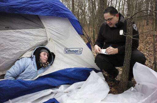 In this Tuesday, Feb. 12, 2019 photo Worcester police officer Angel Rivera, right, asks Brian Pickering, left, if he has been tested for for Hepatitis A at the entrance to a tent where Pickering spent the night in a wooded area, in Worcester, Mass. The city was hit hard when recent hepatitis A outbreaks across the country started sickening and killing homeless people and illicit drug users. (AP Photo/Steven Senne) The Associated Press