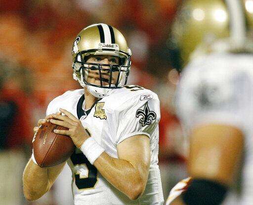 FILE - In this Aug. 31, 2006, file photo, New Orleans Saints quarterback Drew Brees looks to throw during a preseason football game against the Kansas City Chiefs in Kansas City, Mo. Brees hit the open market at age 27 in 2006 after he sustained a serious injury to his throwing shoulder in the 2005 season finale. He chose New Orleans, which itself was making a comeback from Hurricane Katrina. (AP Photo/Ed Zurga, File) The Associated Press