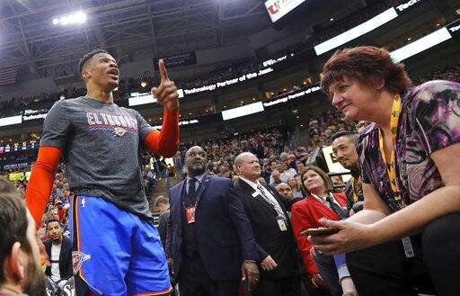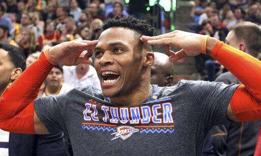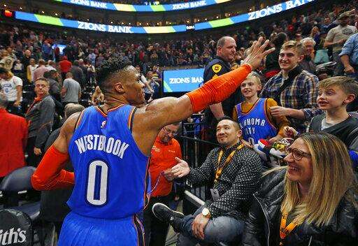 CORRECTS DATELINE TO SALT LAKE CITY INSTEAD OF KEARNS, UTAH - Oklahoma City Thunder guard Russell Westbrook (0) waves to the crowd as he leaves the court following an NBA basketball game against the Utah Jazz, Monday, March 11, 2019, in Salt Lake City. (AP Photo/Rick Bowmer) The Associated Press