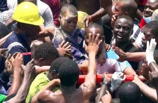 In this image taken from video, people help a child after he was rescued from the scene of a building collapse in Lagos, Nigeria, Wednesday March 13, 2019. A three-story building has collapsed in Lagos, and rescuers rush to pull out scores of children thought to be inside. There was no immediate official word on numbers of casualties. (AP Photo)