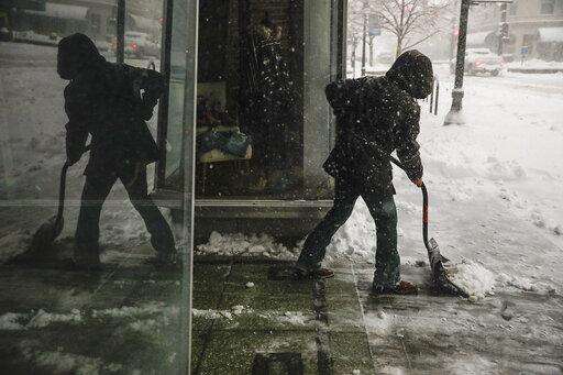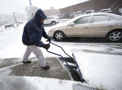 Neil Alderson, executive director of the Schlessman YMCA, moves snow for patrons as a late winter storm packing hurricane-force winds and snow sweeps over the intermountain West Wednesday, March 13, 2019, in Denver. (AP Photo/David Zalubowski)