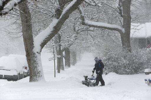 Ryan Bredensteiner of Top Flight Maintenance shovels Central Avenue during a blizzard on Wednesday, March 13, 2019, in Cheyenne. White-out conditions closed I-80, I-25, and U.S. 85, effectively closing off the state capital from Nebraska, Colorado and the rest of Wyoming. (Jacob Byk/The Wyoming Tribune Eagle via AP)